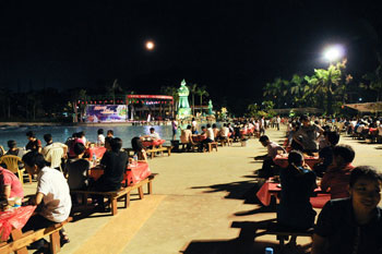 活動當(dāng)日,長江水世界流光溢彩、歌聲飛揚。在造浪池沙灘旁,圓月當(dāng)空、濤聲拍岸,領(lǐng)導(dǎo)與員工濟濟一堂,共仰明月,齊享美食,并不時走動暢談。公司為到場的所有員工和家屬提供了豐盛的應(yīng)節(jié)食品,包括各式月餅、爽滑雞粥、濕炒河粉、新鮮水果、芋頭、菱角等,現(xiàn)場氣氛和美,其樂融融,讓員工真正感受到了金馬“家”的溫暖貼心。