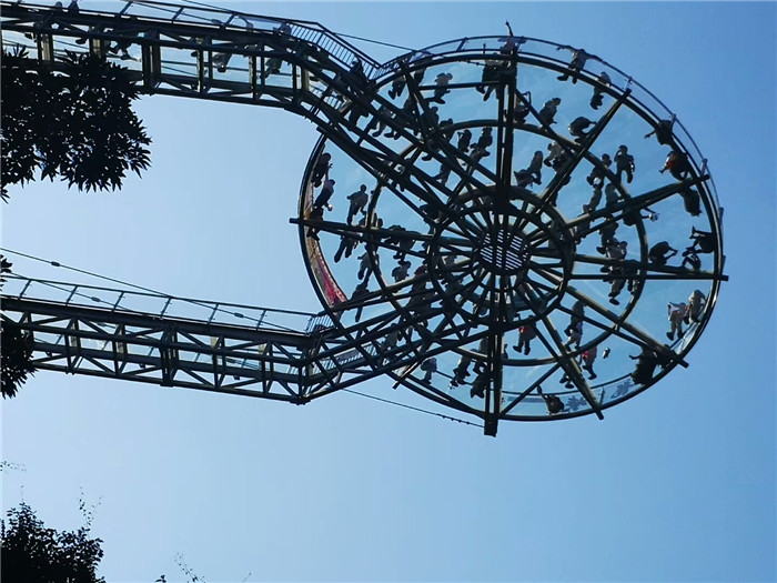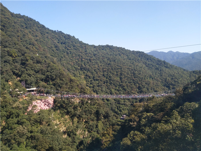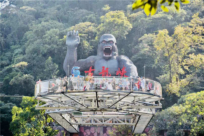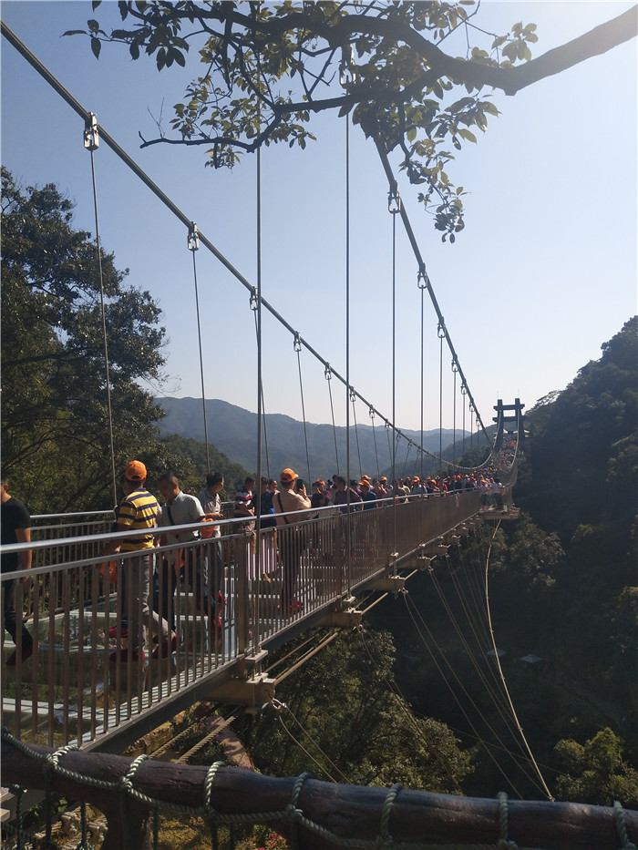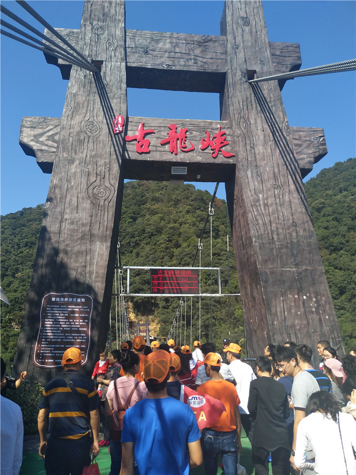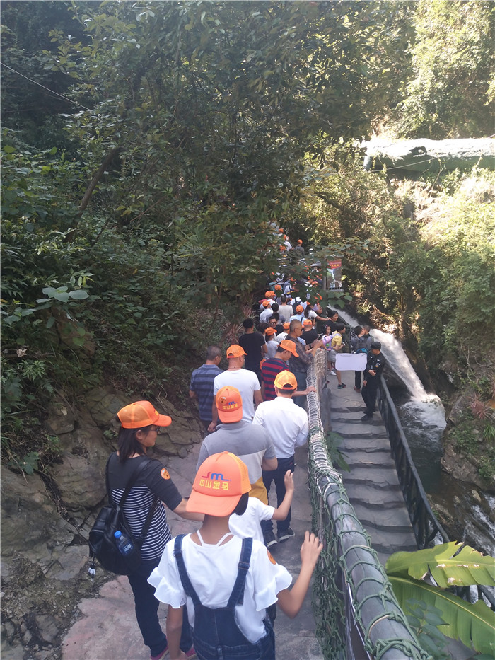 抵達(dá)目的地1——清遠(yuǎn)古龍峽云天波霸。這個(gè)以獲得四項(xiàng)世界紀(jì)錄著稱的景區(qū)景區(qū),逢周末閑日和天公作美,此刻更是人山人海,縱使如此,500多名金馬人們?nèi)允浅尸F(xiàn)出了良好的團(tuán)體素質(zhì)和修養(yǎng),文明就餐、有序排隊(duì)、耐心等候......景區(qū)內(nèi)仿佛形成了一道新的橙色人文風(fēng)景線。隨后,沿途爬山、觀光、賞瀑、自拍、擺拍、合影......歡笑和驚呼連綿不斷。走上最大規(guī)模的高空觀光玻璃組合云天波霸,驚險(xiǎn)和刺激正式登場(chǎng):世界最長(zhǎng)最寬的329米觀瀑玻璃橋、UFO造型的懸空玻璃平臺(tái)、“守護(hù)神”巨型猩猩雕塑,漫步其中,猶如閑庭散步;俯視下方,卻又步步驚心!
