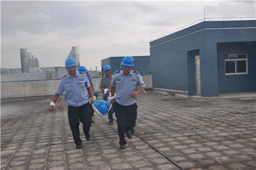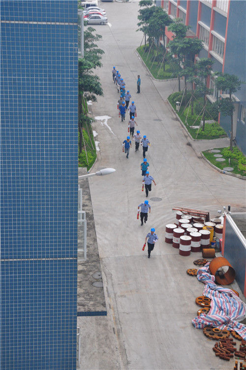 本次演練以消防重點車間的頂層出現(xiàn)火災(zāi)警情為模擬場景,于計劃當日下午15:45進行。在正式開始前,金馬義務(wù)消防隊在公司大門集結(jié),配備相關(guān)設(shè)備整齊列隊,等待總指揮下達啟動命令。時間一到,由生產(chǎn)中心高總、人力資源中心容部長示意行動開始,保安隊長接受命令,并向待命的消防隊傳達立即到處滅火的指示。接到消息,金馬義務(wù)保安隊火速奔赴火警現(xiàn)場——距離出發(fā)點300多米的車間4樓頂層。僅用時2:37,撲火組已到達現(xiàn)場,根據(jù)燃燒物特性,用滅火器迅速進行第一輪滅火。待火勢稍減,他們快速移開燃燒物,阻擾火勢蔓延,并打開消防喉進行撲救。與此同時,救護組也已到達現(xiàn)場,展開擔(dān)架轉(zhuǎn)移傷員,到達安全場所進行搶進。不久,火勢撲滅,在各消防小組的密切配合下,本次消防演練勝利結(jié)束。