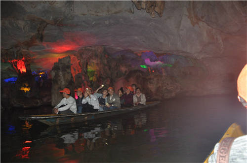 鏡頭一:賞過風景如畫的鼎湖山,我們來到了盛名遠傳的七星巖。七座形態(tài)各異的山峰,八個壯觀非凡的巖洞,移步換景之間,我們都不由得驚嘆于這里的每一處神秘。小艇輕游在龍巖洞的腹中暗河上,裹身于石壁鐫刻與溶洞奇景,頗有世外桃源之境。