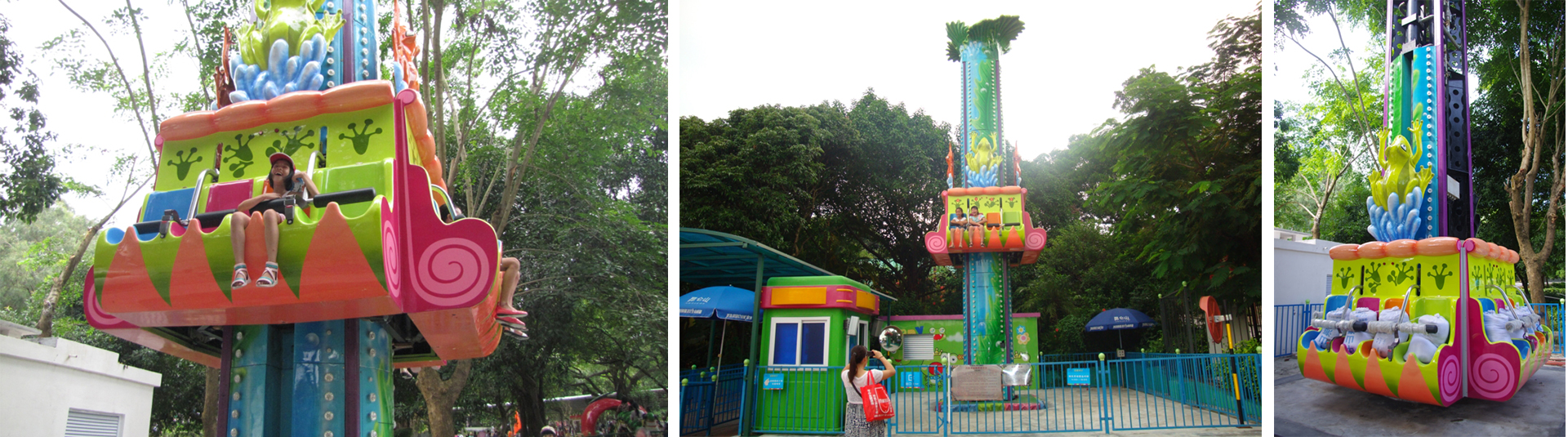 四??蛙跳以跳躍為主題,座艙沿著豎直的?柱軌道作上升、下降和連貫的跳躍運(yùn)動,使乘客在超重與失重的過程中盡情體驗(yàn)跳躍樂趣。