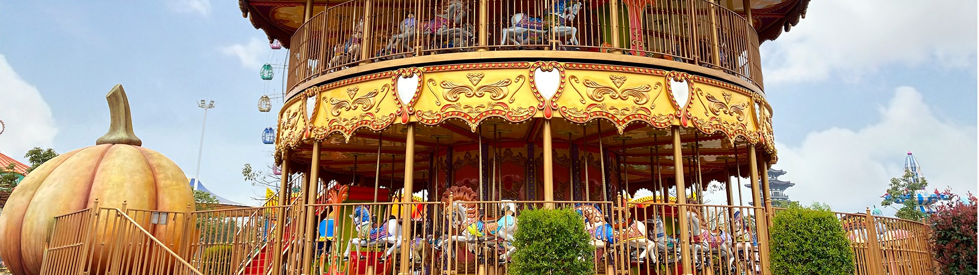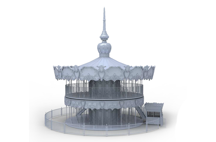 豪華雙層轉(zhuǎn)馬是上、下層可單獨(dú)作旋轉(zhuǎn)運(yùn)動(dòng)的裝飾豪華的轉(zhuǎn)馬,采用歐洲皇家的古典豪華的裝飾風(fēng)格。蓬頂?shù)幕使诩馑睕_云宵,天花板、內(nèi)圍板鑲嵌著彩色浮雕,并配備彩燈。馬匹及宮庭式馬車結(jié)合多彩的花飾,造型奢華大氣流光溢彩。