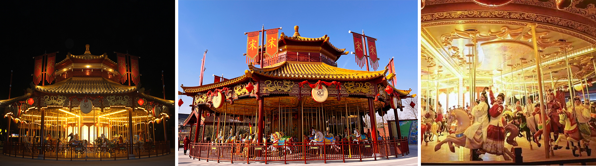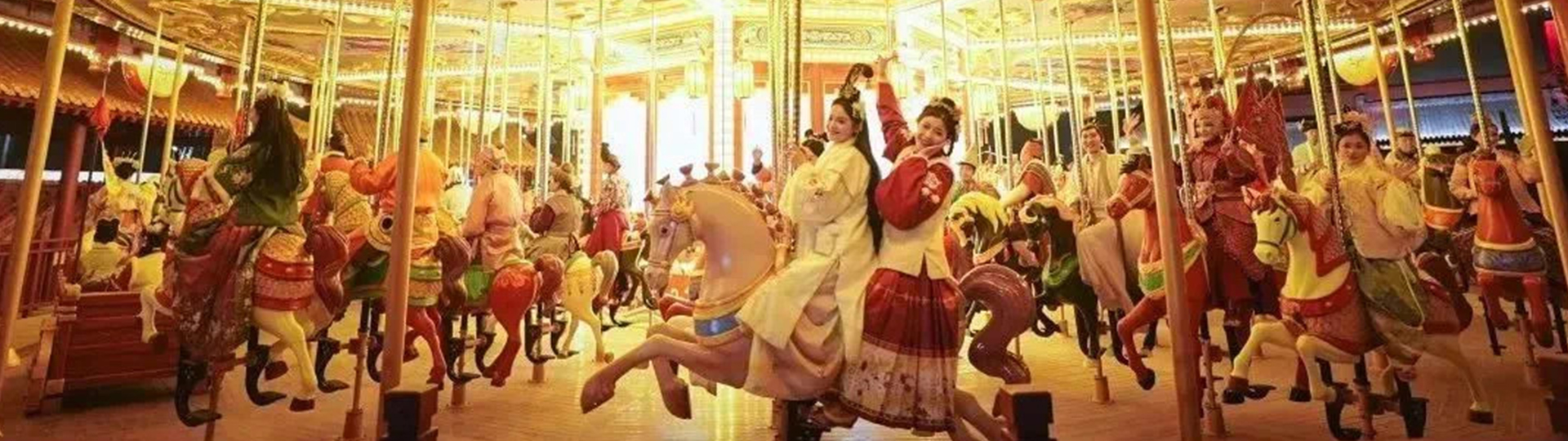設備通過宋代的建筑整體風格包裝,岳飛的千里骕骦駒帶領岳家軍的軍隊排兵布陣陣列,宋、岳軍隊集結的陣式蓄勢待發(fā)。以現(xiàn)代生動的雕刻繪畫手法適當?shù)目ㄍㄉ时磉_馬匹造型,符合家庭親子游客的游玩審美趣味。讓乘客化身為“背嵬軍”隨岳飛出征北伐,體驗馳騁沙場的感覺。浮雕和絢爛彩燈,馬匹及宮庭式馬車結合多彩的花飾,造型精致夢幻。