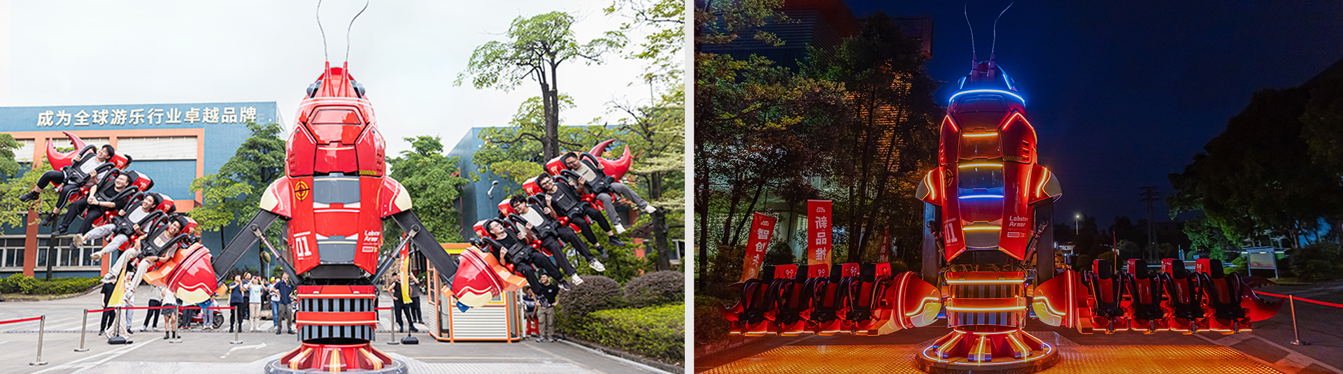 JQJ-16A巨鉗戰(zhàn)甲,設(shè)備結(jié)構(gòu)較新穎,體驗(yàn)感驚險(xiǎn)刺激。開(kāi)始運(yùn)?時(shí)設(shè)備主體先上升,上升到?定?度后,進(jìn)?公轉(zhuǎn)并伴隨著座艙的?轉(zhuǎn)和升降臂的升降。整體包裝設(shè)計(jì)采?機(jī)械?蝦造型,標(biāo)志性的?蝦紅配?加上煙霧、燈光的效果,帶給游客歡樂(lè)、刺激的體驗(yàn)。